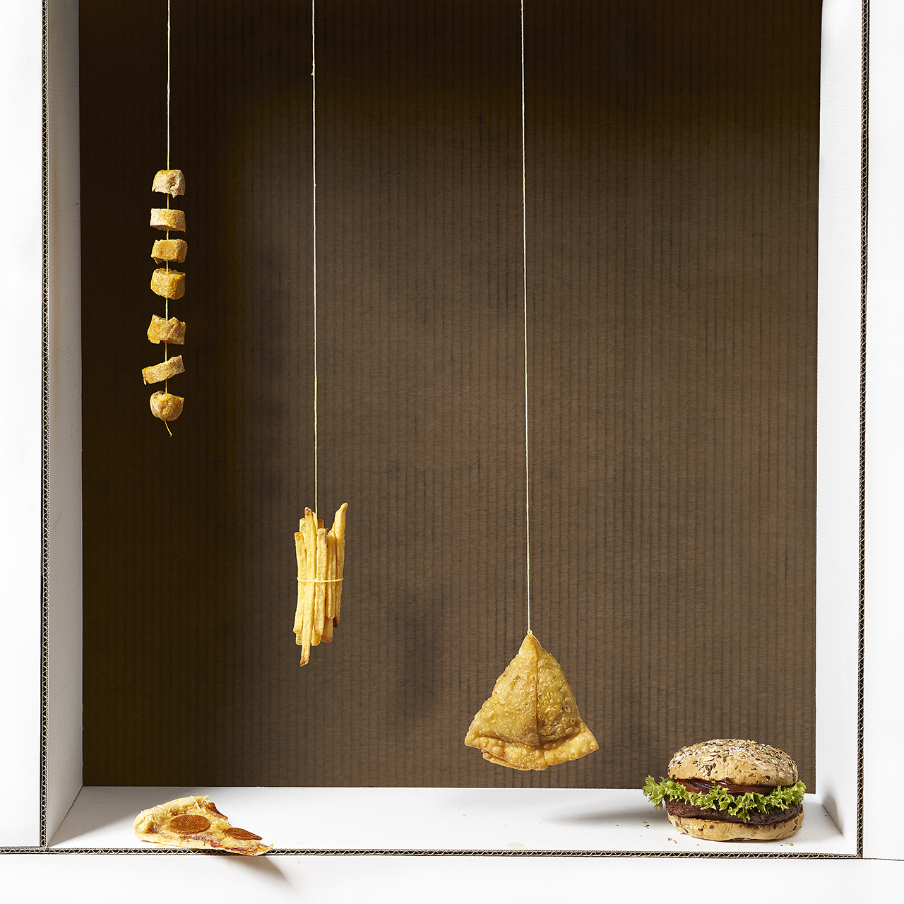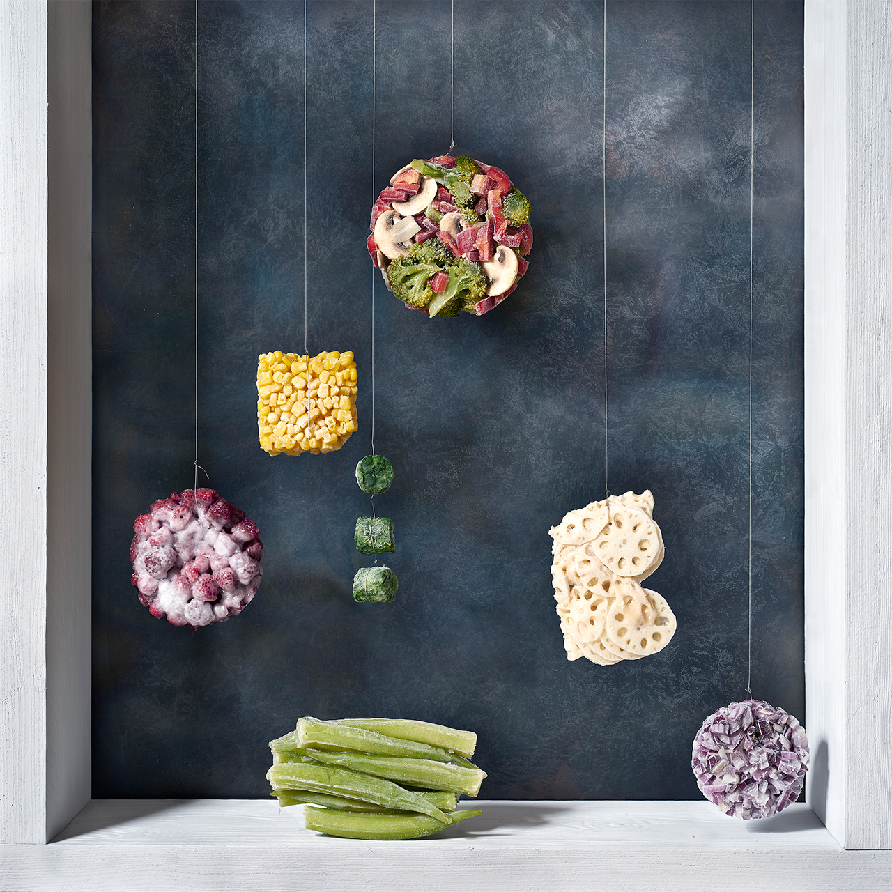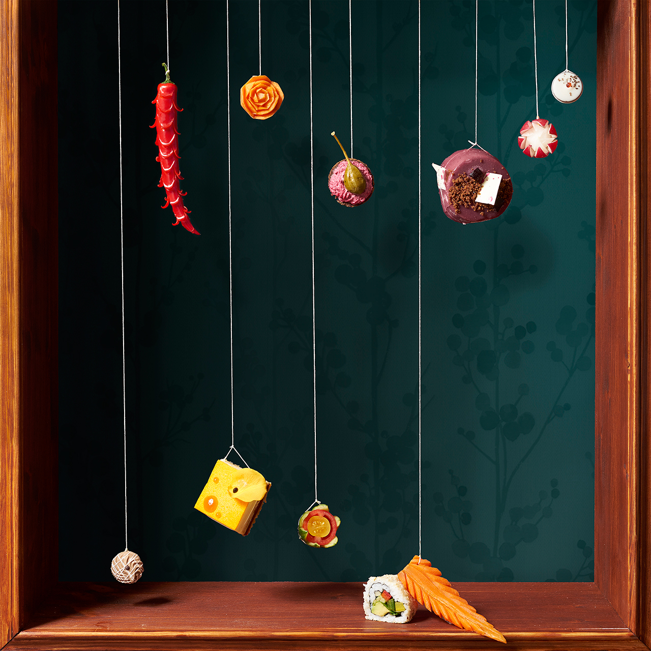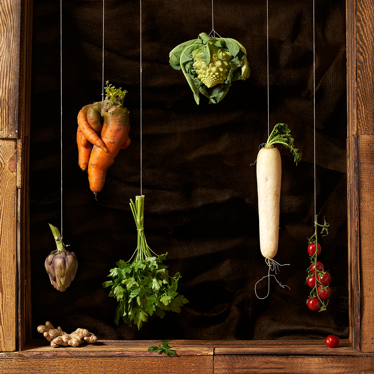 Die Rahmen innerhalb einzelner Stillleben werden thematisch auf die Früchte / Lebensmittel abgestimmt. Anders als bei Cotán haben alle Rahmen im weiteren Sinne mit Holz zu tun, um einen Bezug zum Organischen herzustellen. Der Zustand, in dem das Holz sich befindet, spiegelt den Zustand der Lebensmittel. Auch der Hintergrund verfolgt dasselbe Prinzip, auch wenn dieser sehr dunkel gehalten ist, um die dadurch erzeugte Distanz und Separation zu erzielen. Das Aufhängen der Früchte ist nicht nur als Referenz an die Gemälde, sondern auch inhaltlich zu verstehen. Kompositorisch findet durch die vertikalen Linien der Schnüre eine starke Trennung innerhalb der Bilder statt. Gleichzeitig sind die Lebensmittel durch die Hängung losgelöst. Sie schweben getrennt voneinander, dieses Element ist in allen Bildern wiederzufinden. Es symbolisiert für mich, wie wenig a priori festgelegt ist, was für eine Bedeutung einem bestimmten Lebensmittel, z.B. einer Möhre oder einer Kartoffel, beigemessen wird. Diese wird erst im Betrachten des Gesamtbildes sichtbar. Erst durch Anbau, Verpackung, Weiterverarbeitung bekommt die einzelne Frucht die Wertung, die wir ihr geben. Es liegt an uns, was wir daraus machen.