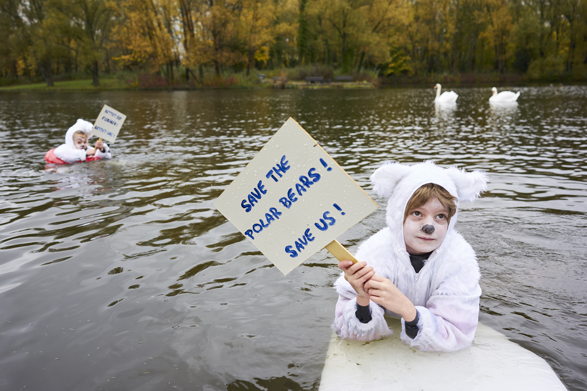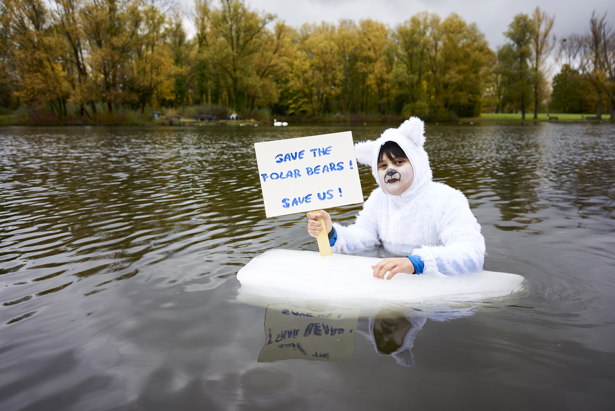 Als Eisbären verkleidet, mit Neoprenanzügen und einer echten Eisscholle bewaffnet gingen sie – dem widrigem Novemberwetter zu Trotz – in eine See in der Rheinaue, um gegen den Klimawandel zu protestieren. Im Hintergrund das Konferenzzentrum in dem zum selben Moment die Politiker tagten.